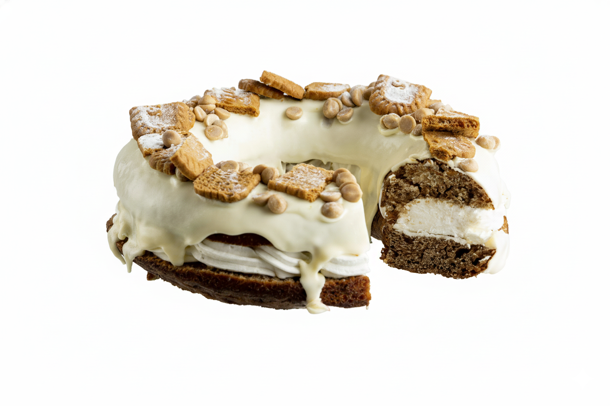 كيكة جزر إسفنجية، قرفة، زنجبيل، جوز، قرنفل وجوزة الطيب، محشوة بجبنة الكريم الخاصة بنا. مزينة بطبقة من الشوكولاتة البيضاء، زينة ذهبية وكوكيز منظار.