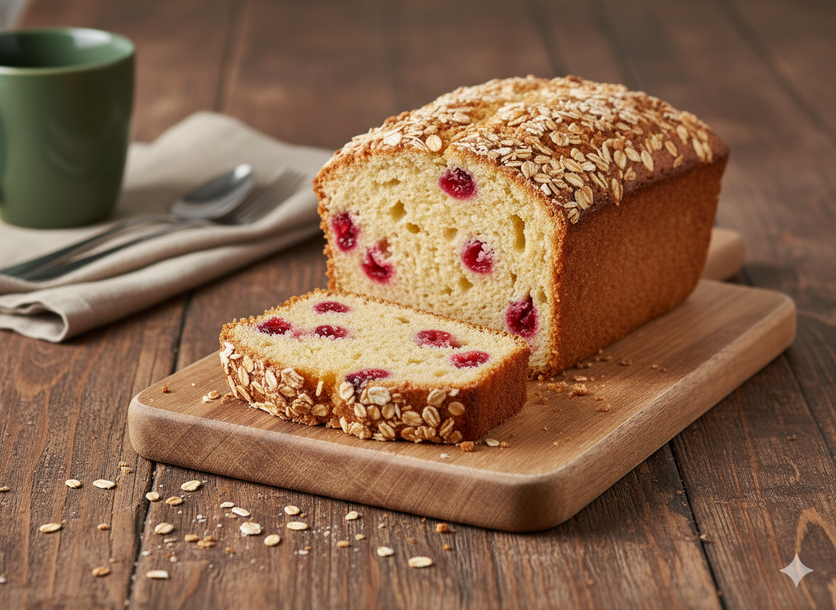 كعكة إسفنجية لذيذة بالفانيليا والزبادي مليئة بالتوت الأزرق ومزينة بالشوفان والسكر المكرمل.
