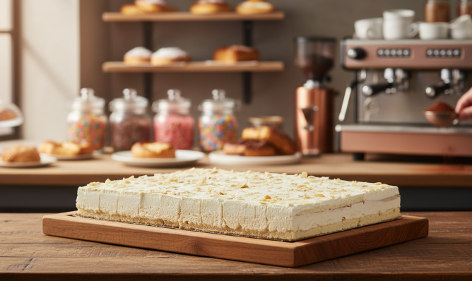 بلانشة ذات قاعدة كيكة إسفنجية محشوة ومزينة بموس الكريمة واللوز الرقائقي على السطح.