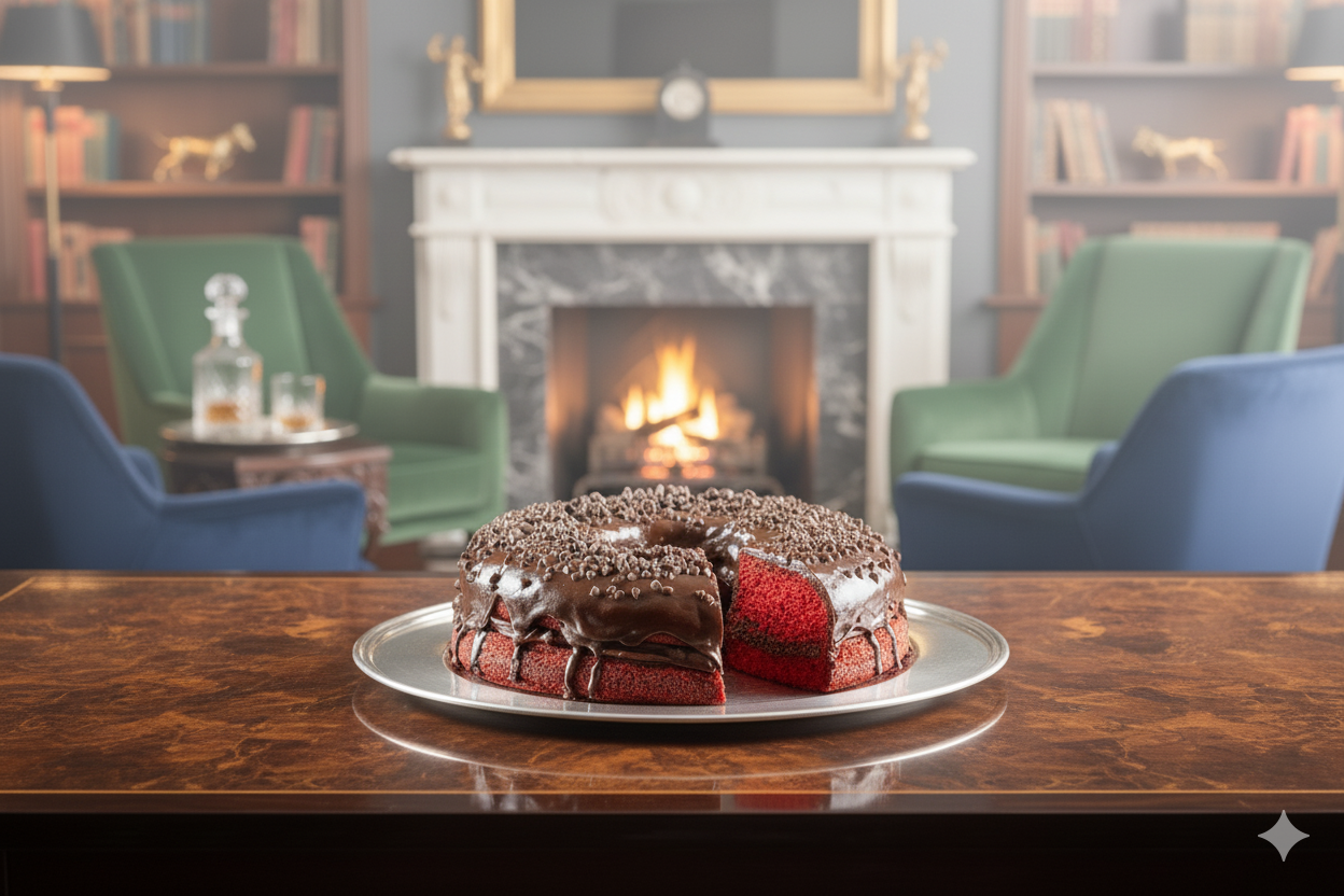 كيكة إسفنجية بالكاكاو الأحمر، مليئة بكريمة فادج الشوكولاتة. مزينة بطبقة من الشوكولاتة وقطرات الشوكولاتة