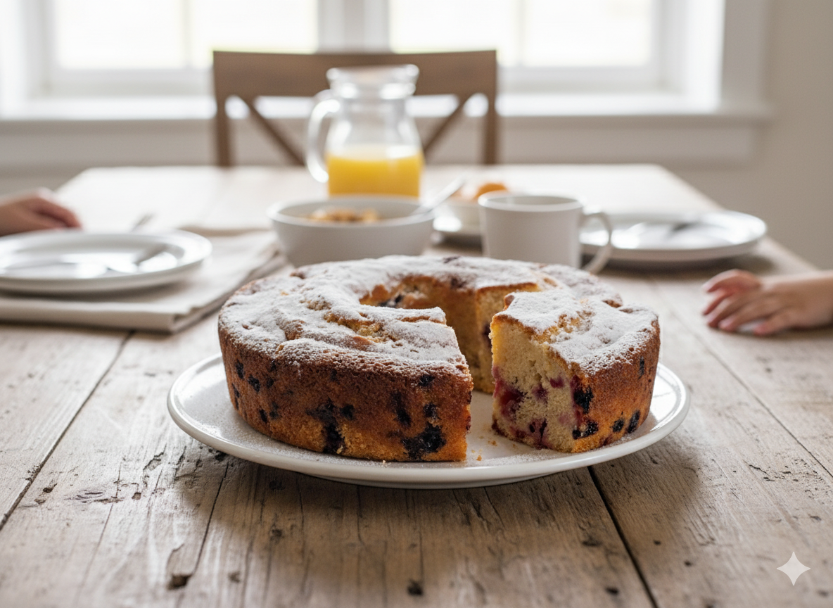كيكة فانيليا إسفنجية لذيذة مليئة بالكشمش الأحمر والأسود ومزينة بالسكر البودرة.