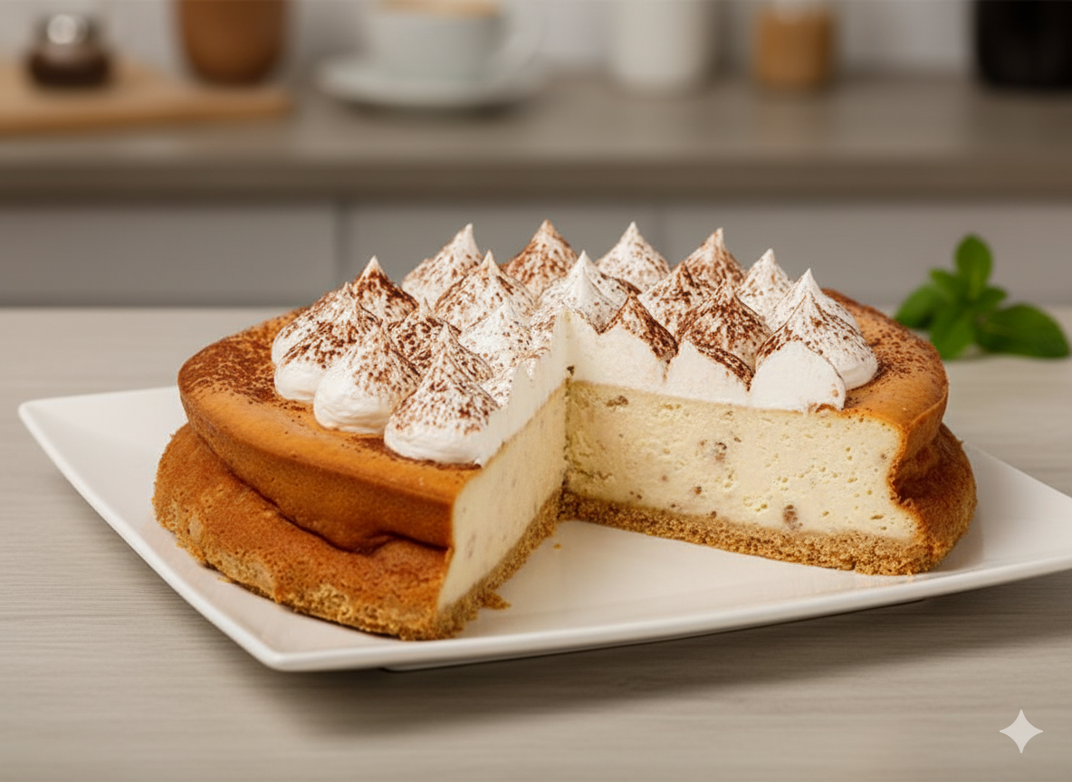 Cream cheese cake with vanilla from Magasdacar, baked with digestive cookie base. Decorated with vanilla mousse and a touch of cocoa.