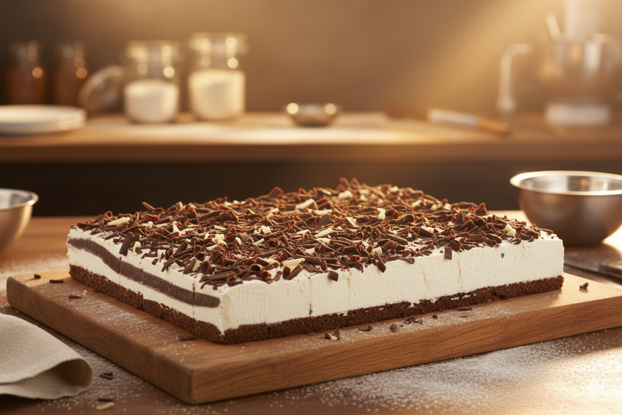 Cake with chocolate sponge base filled with cream and cherries, decorated with chocolate shavings and icing sugar.