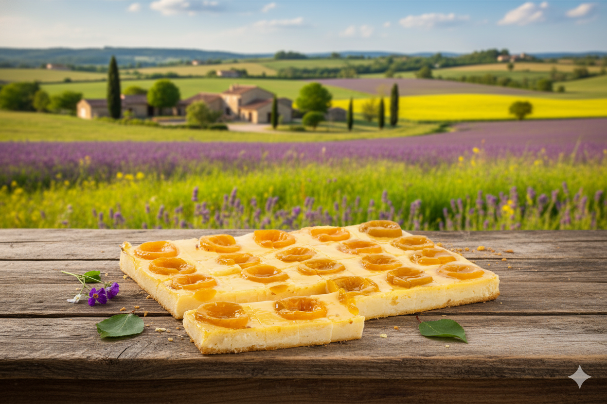 Sponge cake base, covered with a layer of pastry cream, decorated with peach (18%) and almond.