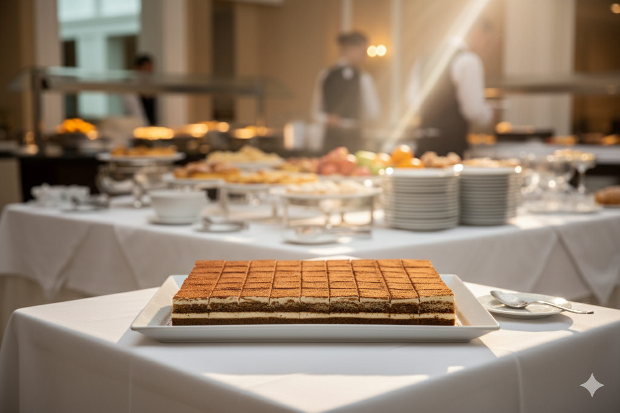 Plancha with sponge base dipped in coffee and tiramisu filling decorated with cocoa.
