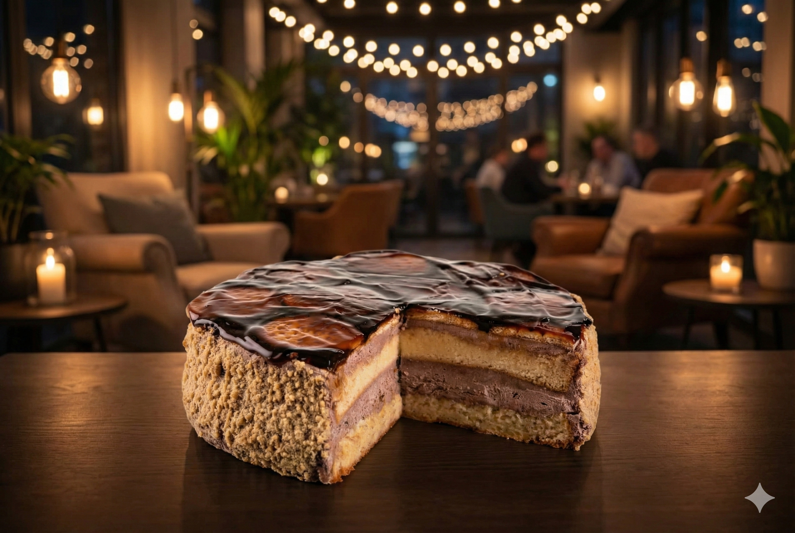 Traditional cookie cake, assembled with sponge cake with cookie pieces, filled with chocolate mousse. Base with cookie crumbs and decorated on the surface with Maria cookies and caramel jam.