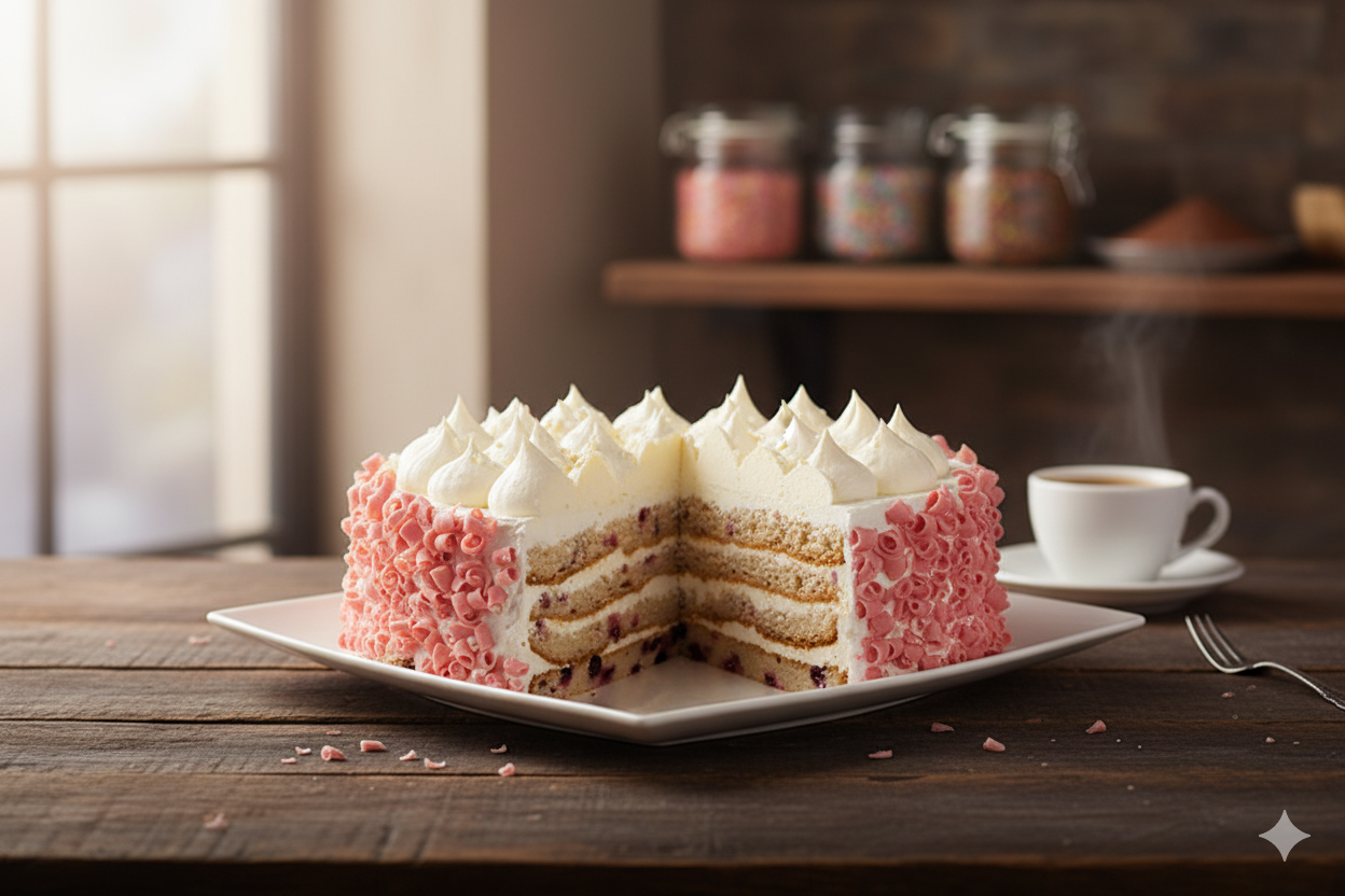Cuatro capas de bizcocho con arándanos y crema de queso; decoradas con mousse de limón, virutas de fresa y chocolate blanco