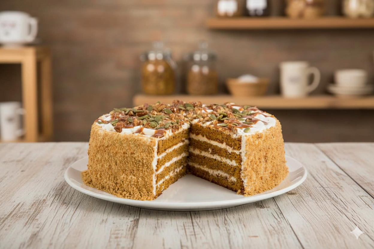 Cuatro capas de bizcocho de calabaza, rellena de nuestra crema de queso, con azúcar morena y canela. Zócalo de migas de galleta y decorada con nueces pecanas, dulce de leche y pipas de calabaza.