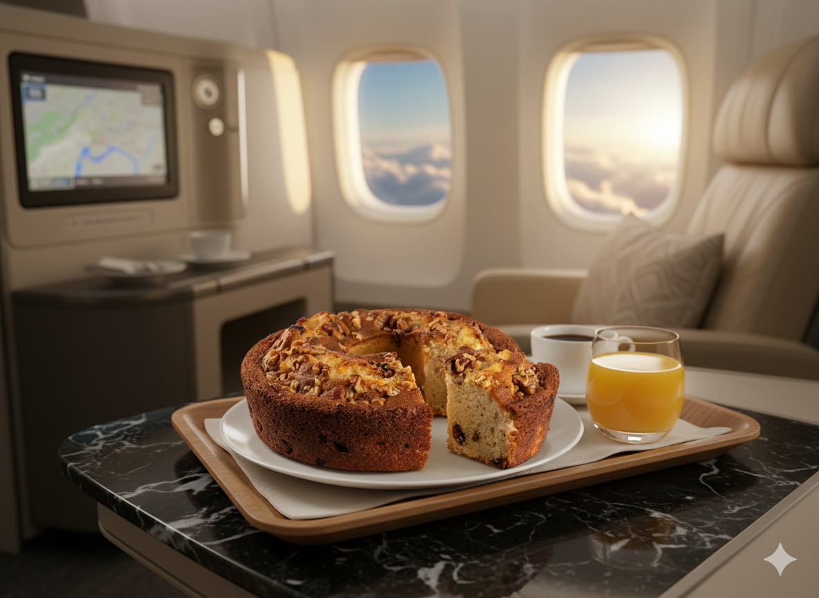 Tradicional bizcocho vainilla relleno de pasas, manzana y decorado con nueces troceadas