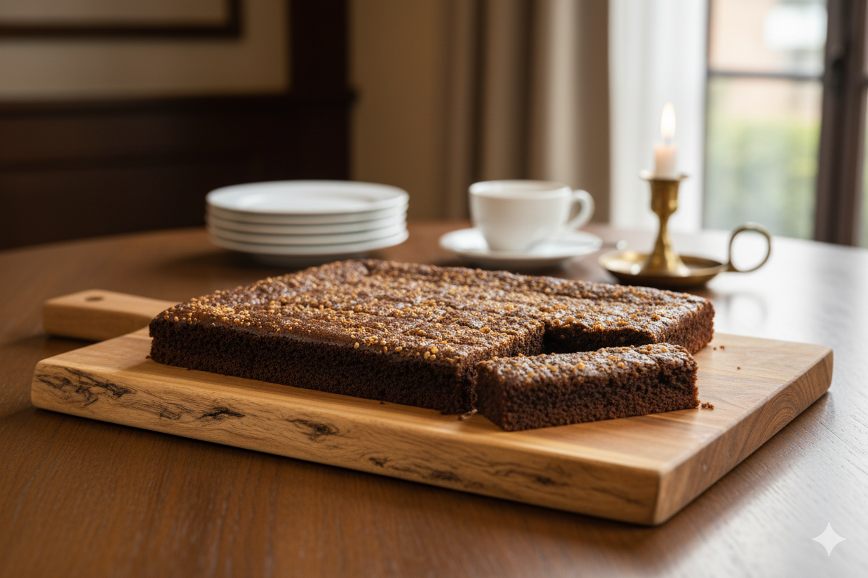 Plancha especial de chocolate, con mantequilla y cobertura de chocolate, decorada con nueces picadas.