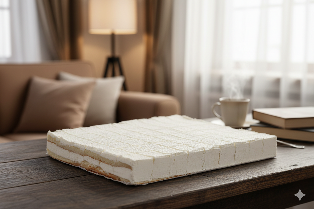 Plancha con base de bizcocho sabor coco decorada con coco rallado.