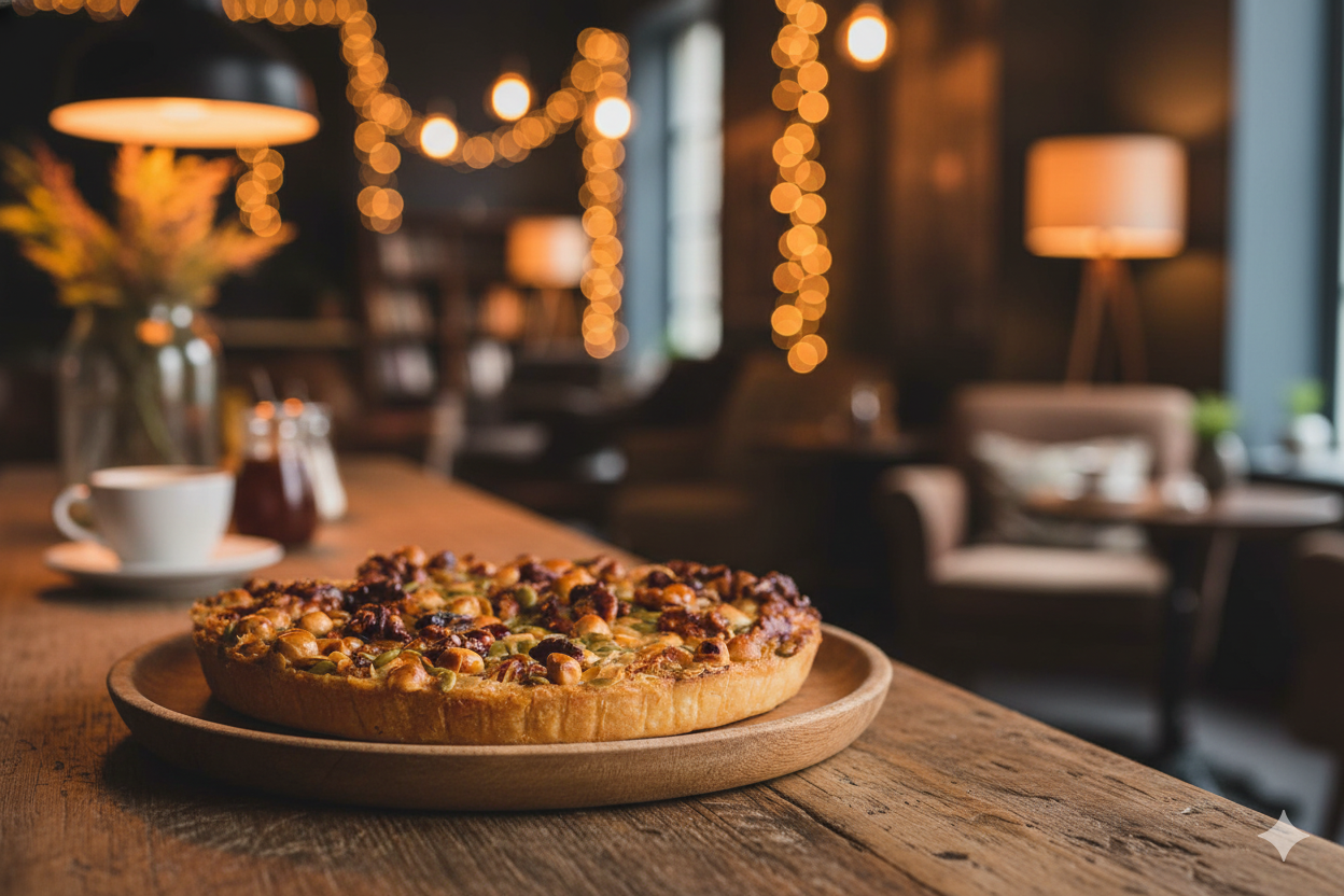 Tarta realizada con pasta sable de mantequilla rellena de crema pastelera y decorada con frutos secos variados.